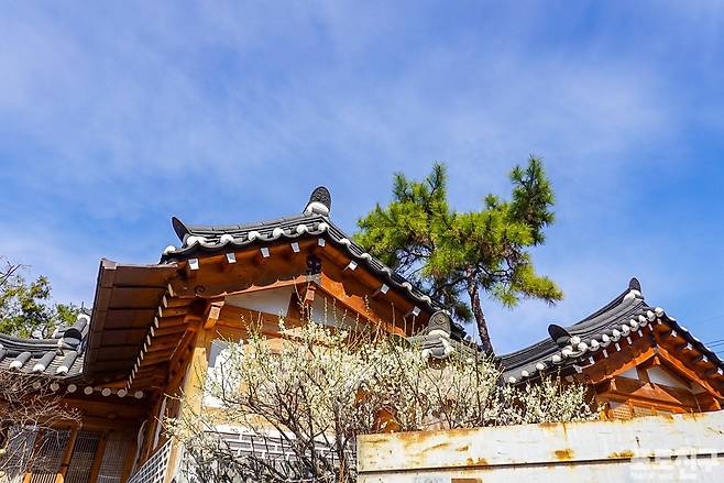 한옥 기와 담장 옆에는 매화가 활짝 피어 화사합니다.