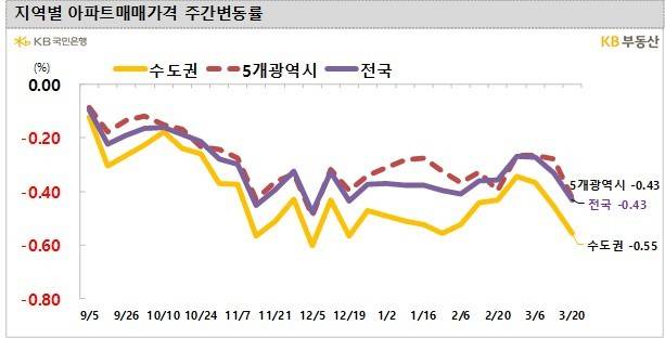 23일 KB부동산 주간 주택시장 동향에 따르면 이번 주 전국 아파트 매매가격은 전주(-0.33%) 대비 낙폭이 커지면서 0.43% 떨어졌다.