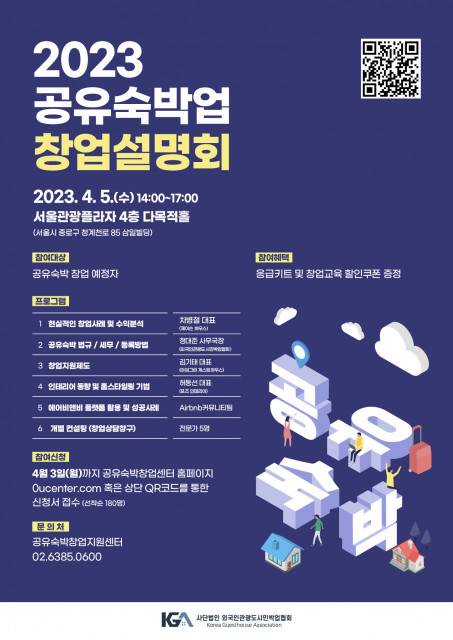 서울/경기 지역 설명회에 참가를 원하는 공유숙박 창업을 희망하는 예비 창업자는 4월 3일(월)까지 공유숙박창업지원센터 홈페이지 또는 '2023 공유숙박 창업설명회' 포스터 상단의 QR코드를 통해 신청할 수 있으며 선착순 180명 마감이다.