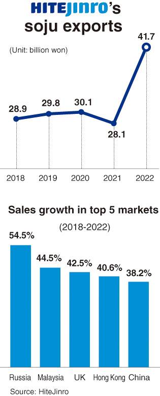 Last year, about 6 percent of HiteJinro’s sales, or 145 billion won ($112 million), came from abroad, with soju making up more than 80 percent of its overseas business. The company exported 116 billion won worth of soju last year, almost half the nation’s total soju exports.