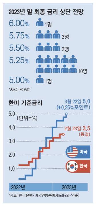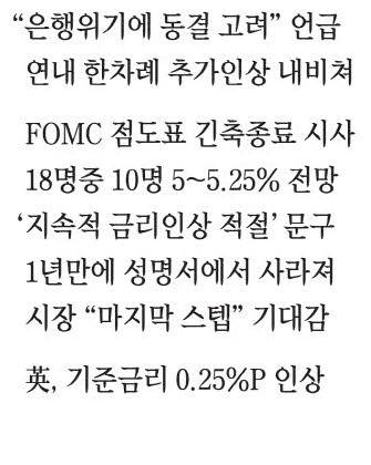 FOMC 위원들도 금리 인상 전망을 담은 점도표에서 올해 말 최종 금리 수준을 5.1%(중간값)로 내다봤다. 이는 지난해 12월 FOMC 전망과 차이가 없는 수준이다. 현재 미국의 기준금리가 4.75~5%인 점을 감안하면 연준의 올해 추가 금리 인상은 한 차례에 그친다는 의미다. 뱅크오브아메리카도 5월 연준이 0.25%포인트 추가 금리 인상을 단행해 최종 금리가 5~5.25%가 될 것으로 전망했다.