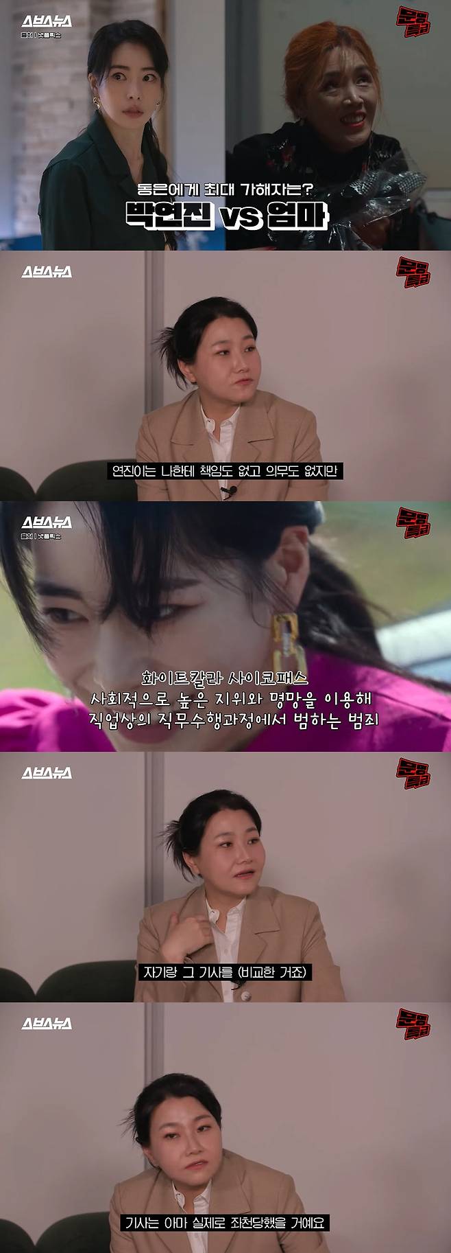 하지만 박연진은 딸 하예솔(오지율 분)에게 자신의 과거 행각을 들켰을 때 무너졌다. 박지선은 "유영철이나 강호순 같은 경우도 자기 아들들은 아주 끔찍하게 생각했다"고 말해 모두를 경악하게 했다.