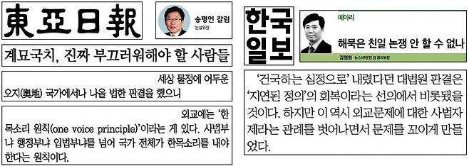 | ▲ 대법원 판결이 ‘사법 자제’ 어겼다며 비판한 동아일보와 한국일보 |