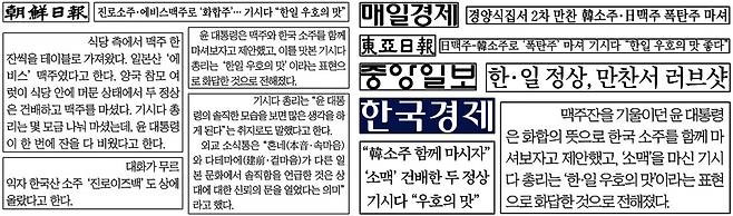 매일경제 <어려운 결단 내린 윤대통령 마음으로부터 경의 표한다>(3월 18일 박인혜 기자, 김규식 특파원)도 "한국 소주와 일본 맥주를 섞은 폭탄주를 놓고 두 사람은 이를 '화합주' '한일 우호주'라고 부르며 웃음을 터뜨리는 등 시종일관 화기애애한 분위기"였다고 전했습니다.