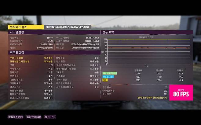 실제로도 웬만한 최신 게임은 아주 거뜬하게 돌리는 모습을 확인할 수 있었다. 먼저 사이버펑크2077을 최고 그래픽 설정인 ‘레이 트레이싱: 울트라’에서 벤치마크 테스트를 실행한 결과 초당 프레임 수치가 112 이상으로 측정됐다. 부드럽고 쾌적한 게임 경험의 최소 조건이 60프레임 이상을 안정적으로 유지하는 것이라고 본다면, 112 이상은 충분하고도 남는 수치다. QHD 해상도의 노트북 자체 디스플레이 대신 외부 디스플레이를 연결해 4K 해상도로 구동하더라도 평균 60프레임 이상을 보장할 수 있을 정도로 여유있는 성능이라 할 수 있다. 이외에도 기어즈5의 벤치마크 테스트에서는 평균 117프레임, 포르자 호라이즌5의 벤치마크 테스트에서는 80프레임 이상의 안정적 수치를 보여줬다.