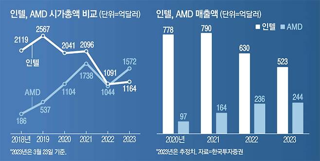 류영호 미래에셋증권 연구원은 “PC 시장에선 상반기까지 재고 조정이 진행될 예정인 만큼 인텔과 AMD의 점유율 상황에 대해 단정 짓기는 어렵다”며 “서버 시장에선 기존 수주물량으로 단기적으로 인텔의 점유율 회복 가능성도 있지만 AMD의 공격적인 가격 정책과 신규 수주를 고려하면 AMD의 점유율 확대가 2024년까지 계속될 것으로 기대한다”고 밝혔다.