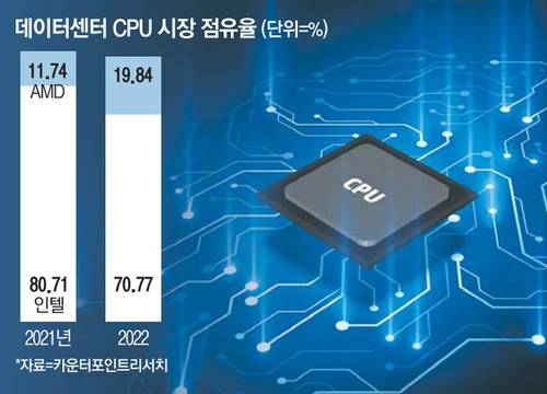 특히 반도체 시장의 상승을 이끄는 주요 테마는 인공지능(AI)으로 대표되는 데이터센터 사업부문에서 AMD의 추격이 빠르게 이뤄지고 있다. 시장조사업체인 카운터포인트리서치에 따르면 지난해 글로벌 데이터센터 CPU 시장에서 인텔의 매출액은 16% 감소한 반면 AMD는 60% 늘었다. 2021년 인텔의 점유율은 80.71%였지만 지난해 70.77%로 줄었다. 반면 AMD의 점유율은 11.74%에서 19.84%로 늘었다. AMD의 서버용 에픽(EPYC) 프로세서 밀란의 시장 수요가 급증한 점이 점유율 상승의 원인으로 지목된다.