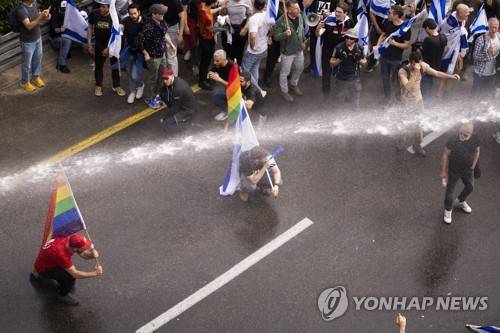 Israeli police use a water cannon to disperse Israelis blocking the freeway during a protest against plans by Prime Minister Benjamin Netanyahu's government to overhaul the judicial system in Tel Aviv, Israel, Thursday, March 23, 2023. (AP Photo/Oded Balilty)