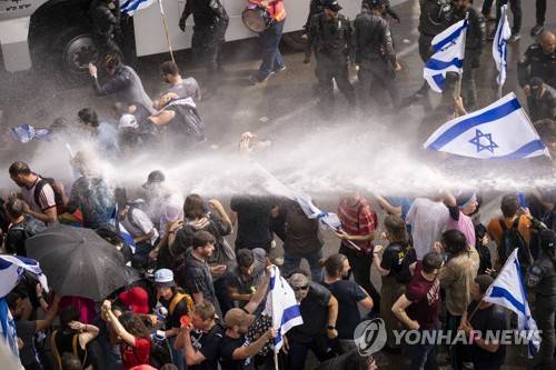 Israeli police use a water cannon to disperse Israelis blocking the freeway during a protest against plans by Prime Minister Benjamin Netanyahu's government to overhaul the judicial system in Tel Aviv, Israel, Thursday, March 23, 2023. (AP Photo/Oded Balilty)