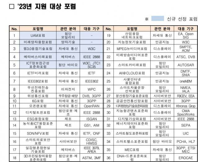 또, 6대 디지털 혁신기술과 연관성이 높은 ‘메타버스 미래포럼’과 ‘웹3.0융합기술포럼’, ‘ICT정보접근성표준화포럼’ 등도 신규 포럼으로 선정했다. 이 밖에 ‘6G포럼’ ‘사물인터넷융합포럼’ ‘디지털트윈포럼’ 등 31개 포럼은 관련분야 표준의 지속적인 보급과 확산을 위해 작년에 이어 올해도 계속 지원한다.