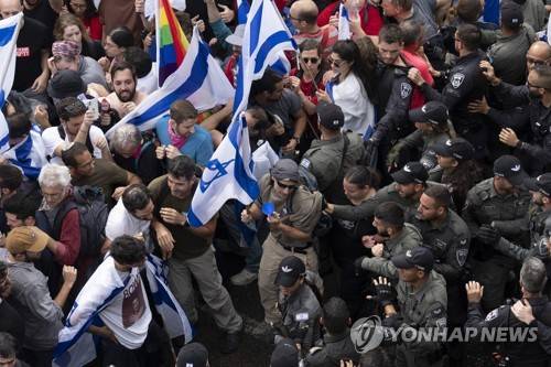 Israeli police scuffle with demonstrators blocking a highway during a protest against plans by Prime Minister Benjamin Netanyahu's government to overhaul the judicial system in Tel Aviv, Israel, Thursday, March 23, 2023. (AP Photo/Oded Balilty)