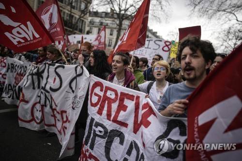 Protesters march during a rally in Paris, Thursday, march 23, 2023. French unions are holding their first mass demonstrations Thursday since President Emmanuel Macron enflamed public anger by forcing a higher retirement age through parliament without a vote. (AP Photo/Christophe Ena)