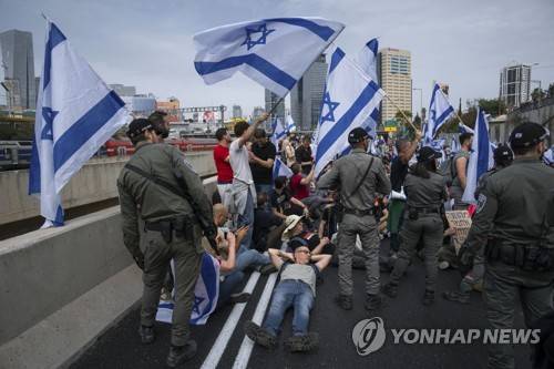 Israeli police try to disperse demonstrators blocking a highway during a protest against plans by Prime Minister Benjamin Netanyahu's government to overhaul the judicial system in Tel Aviv, Israel, Thursday, March 23, 2023. (AP Photo/Oded Balilty)