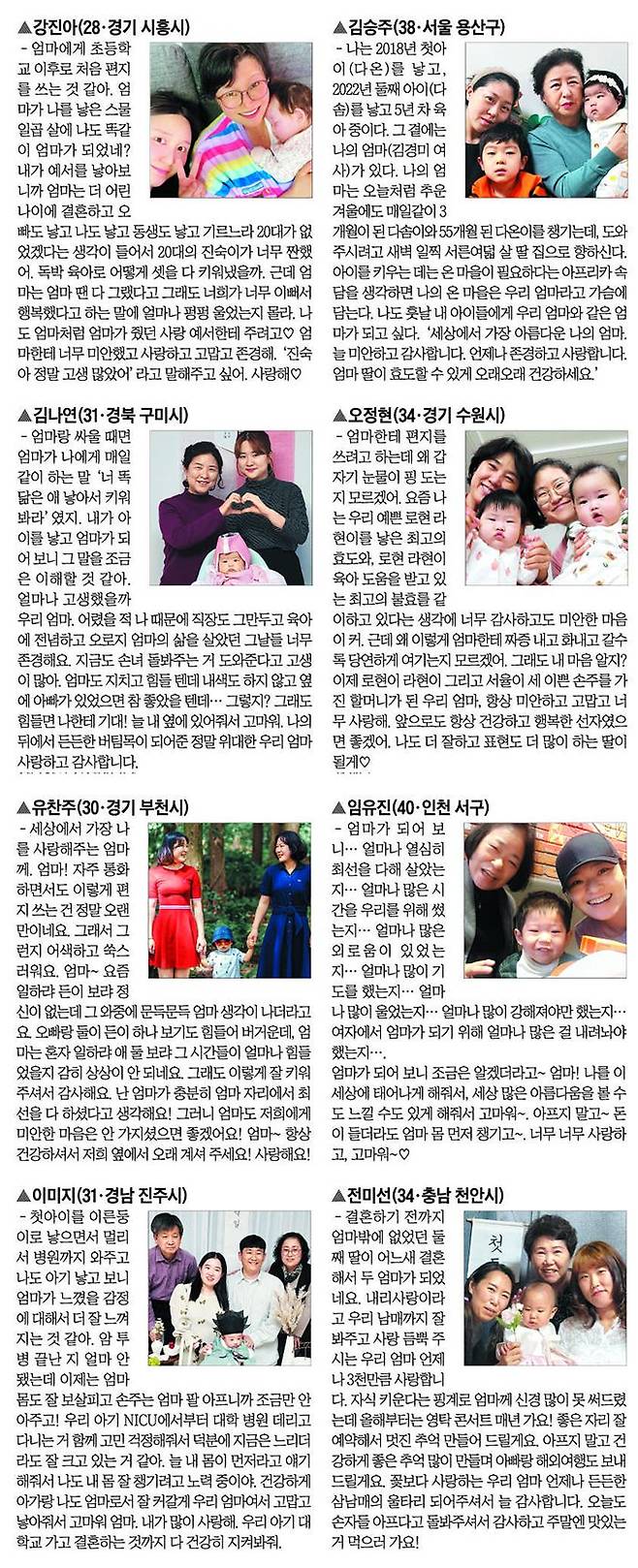 엄마가 된 딸이 엄마에게 편지를 띄웁니다. 젊어선 자식 키우고, 이젠 손자·손녀 돌봐주시는 엄마. 엄마가 돼서야 그 마음을 조금 알게 됐습니다. 늘 곁에 있어서, 또는 곁을 떠나서 표현하지 못한 고마움을 편지에 담았습니다. ‘엄마가 엄마에게 쓰는 편지’는 매일유업 육아 정보 사이트 매일아이(maeili.com)에 접속해 참여할 수 있습니다. 선정된 사연은 ‘아이가 행복입니다’ 지면에 소개합니다. 지면에 사연이 실린 가족에겐 부모님 건강을 위한 ‘셀렉스 코어프로틴 프로 선물 세트’나 ‘골든밀크 선물 세트’를 드립니다.