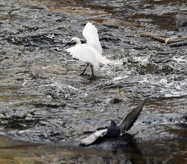 지난 21일 서울 중구 청계천에서 쇠백로와 비둘기가 함께 날갯짓하고 있다. 일부러 호흡을 맞춘 듯 환상적인 댄싱을 선보이는 흑백 듀오의 모습이 신기하다. 그런데 사실 비둘기는 예년보다 일찍 찾아온 더위를 물장구로 식히는 중이었고, 쇠백로는 먹이를 찾아 이동하는 순간이었다. 이런들 어떠하고 저런들 어떠하리. 봄날의 신명 난 춤사위가 볼만했으면 그뿐.