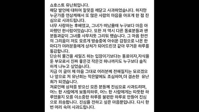 이번엔 쇼호스트 유난희 씨가 화장품 판매 방송 중, 고인이 된 개그우먼을 언급해 공분이 일고 있습니다.