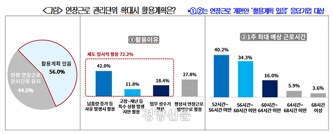 24일 대한상의가 연장근로를 하고 있는 302개 기업을 대상으로 ‘근로시간제도 개편방안에 대한 의견’을 조사한 결과, 연장근로 관리 단위가 ‘주’에서 ‘월·분기·반기·연’ 단위로 확대될 경우 기업의 56%가 바뀐 연장근로제도를 활용하겠다고 답했다.