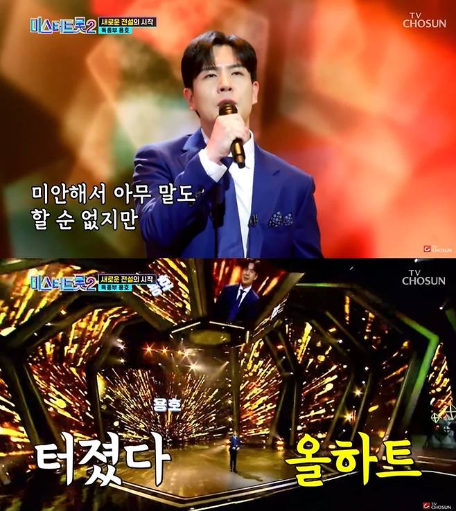 가장 중요한 목표는 '올 하트'였다는 용호는 "제가 데뷔한 지 1년이 좀 넘었다. 저보다 더 길게 고생하고 트로트 하시는 분들이 있다. 무명도 길고 어떤 기회가 주어지지 않는 경우가 많은데, 저라는 사람은 정말 남들보다 훨씬 빠르게 왔다고 생각하기 때문에 너무 욕심을 많이 갖지 않는 게 중요하다고 봤다. 요것만으로도 충분한 성과고, 어차피 더 올라갔어도 한계가 있을 것이다. 아직 시간이 더 필요하다는 생각이 들었다"라고 설명했다.