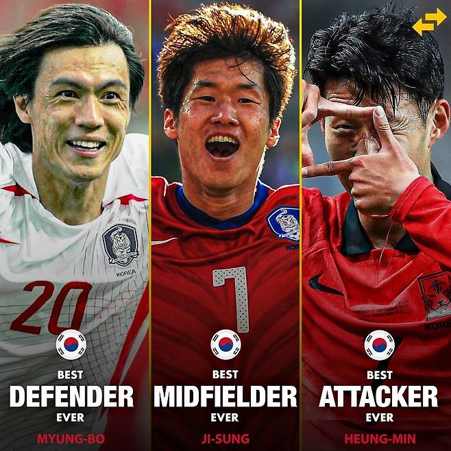 대한민국은 손흥민, 박지성, 홍명보가 공격수, 미드필더, 수비수에 이름을 올리면서 최고 조합을 자랑했다.