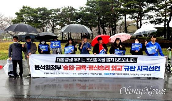 대학생들이 24일 경남 진주 경상국립대학교 앞에서 이같이 외쳤다. 더불어민주당 경남도당 대학생위·전국대학생위와 경남청년진보당이 '윤석열정부의 숭일·굴욕·정신승리 외교 규탄 시국선언'을 한 것이다.