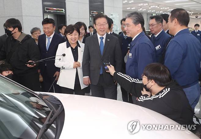 (울산=연합뉴스) 김용태 기자 = 더불어민주당 이재명 대표가 24일 오후 현대자동차 울산공장 홍보관에서 장재훈 현대차 사장과 전기차인 아이오닉5를 살펴보고 있다. 2023.3.24