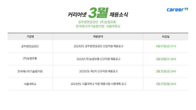 취업포털 커리어가 공무원연금공단, 농협유통, 한국에너지기술평가원, 서울대학교의 채용 소식을 24일 발표했다.