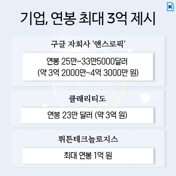 구글 자회사인 앤스로픽은 연봉 25만~33만5000달러(약 3억 2000만~4억 3000만 원) 제시했으며, 클래리티토는 연봉 23만 달러(약 3억원)을 내걸었다. 국내기업인 뤼튼테크놀로지스 또한 연봉 1억 원을 제시했다.