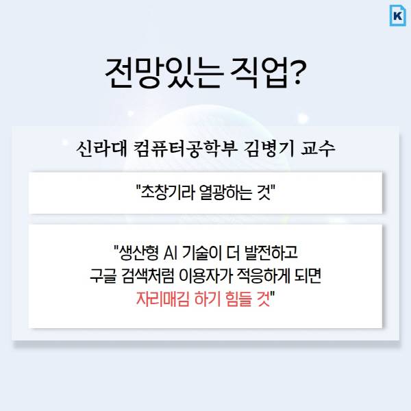 신라대 컴퓨터공학부 김병기 교수는 프롬프트 엔지니어에 대해 “초창기라 열광하는 것이다”라고 말했다. 이어 “포털 검색처럼 사람들이 사용해 익숙해지거나 개발자가 누구나 이용할 수 있게 기술을 발전시킬 것이다”라며 “직업으로 자리매김하기 힘들 것”이라고 말했다.