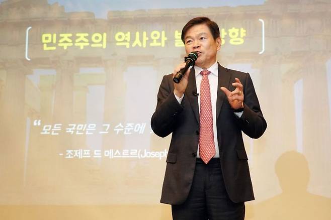 이필형 동대문구청장이 국민대 측 재요청으로 24일 국민대학교 본부관 1층 학술회장에서 학부생 200명을 대상으로 '민주주의 역사와 발전 방향'에 대한 강의를 펼쳤다.