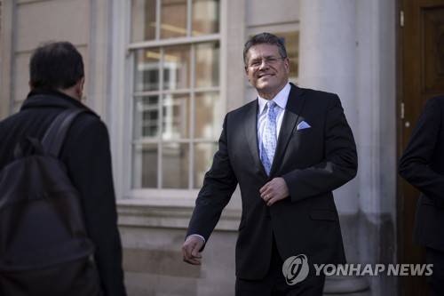 epa10540805 Vice-President of the European Commission Maros Sefcovic leaves the Europa House, Delegation of the European Union to the United Kingdom, after signing off the new Brexit Northern Ireland agreement with Britain?s Foreign Secretary James Cleverly (not pictured), in London, Britain, 24 March 2023. The renegotiated Brexit deal for Northern Ireland, known as the Windsor Framework, is aimed at improving the trade between the UK and the European Union. EPA/TOLGA AKMEN