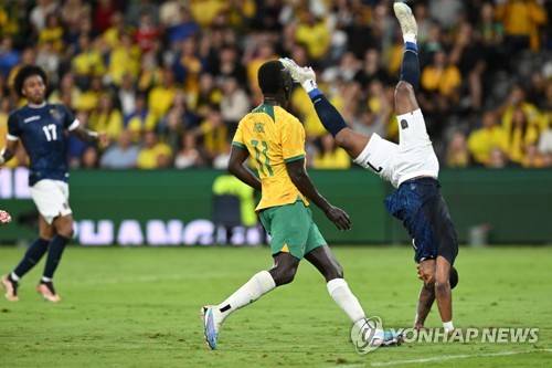 epaselect epa10540174 Pervis Estupinan of Ecuador flies through the air after colliding with his own goalkeeper during the soccer friendly match between Australia and Ecuador in Sydney, Australia 24 March 2023. EPA/DEAN LEWINS AUSTRALIA AND NEW ZEALAND OUT