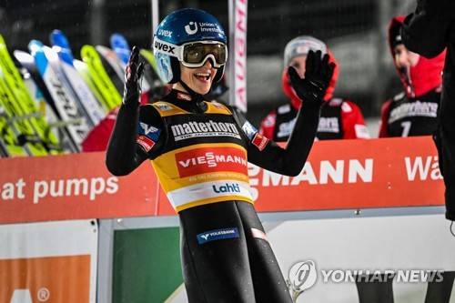 epa10541133 Eva Pinkelnig of Austria reacts in the finish area during the final round of the Women's HS130 competition at the FIS Ski Jumping World Cup in Lahti, Finland, 24 March 2023. EPA/KIMMO BRANDT