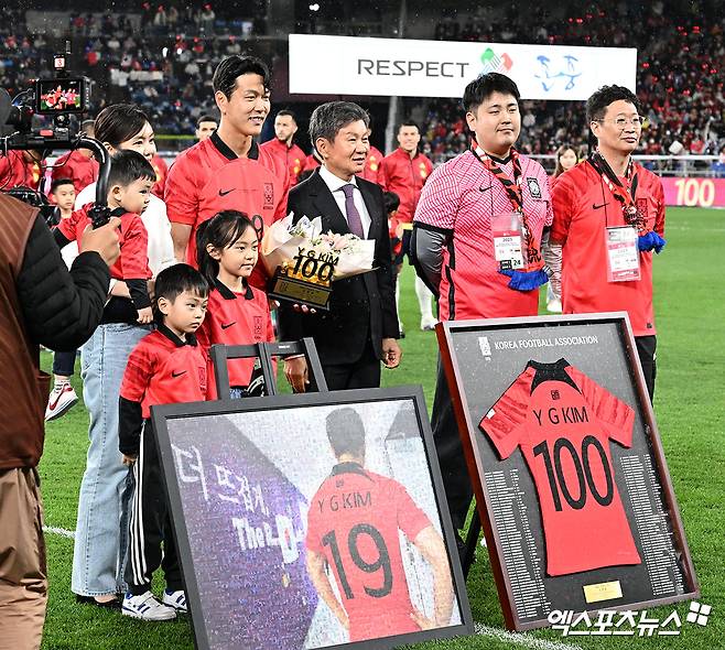 이날 경기에 앞서 김영권은 A매치 100경기 출전, 센추리 클럽 가입 축하 행사를 진행했다. 그는 가족들과 함께 축하받으며 뜻깊은 경기를 치렀다.