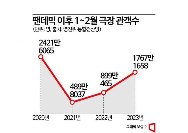 지난 1~2월 분위기는 코로나19가 생겨난 2020년 1~2월보다 좋지 않았다. 국내 첫 코로나19 확진자가 나온 2020년 1월에는 2421만6065명, 2월에는 489만8037명 총 2421만6065명이 극장을 찾았다. 그 때보다 올해 더 관객이 없었다. 지난 1월 1125만361명, 2월 642만1297명을 동원하며 1767만1658명이 극장에 발걸음했다. 영화 관계자 D씨는 "3년 전 1월, 극장에서 첫 확진자가 나오면서 그해 1~2월 영화관에 관객 발길이 뚝 끊겼다. 당시보다 올해 1~2월 관객이 줄었다. 업계에서는 위기의식을 넘어 공포를 느낀다"고 말했다.