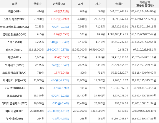 또한, 리플(7.72%, 614원), 메탈(5.05%, 1,665원), 룸네트워크(4.65%, 94.5원), 스트라티스(2.04%, 749원)가 상승세를 나타냈다.