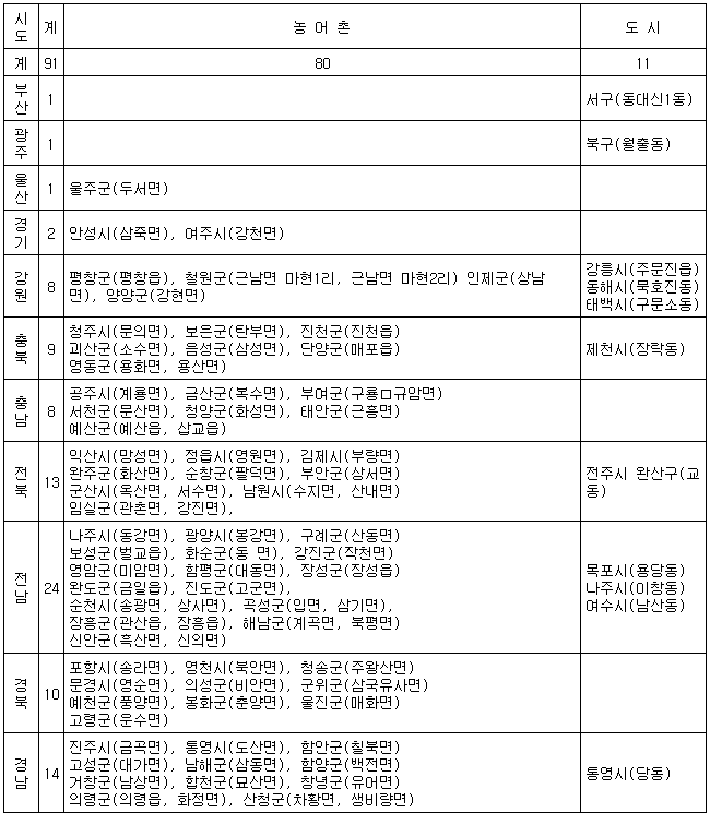 전북은 익산시 망성면, 정읍시 영원면, 김제시 부량면 등 13곳이고 경북은 포항시 송라면, 영천시 북안면, 청송군 주왕산면 등 10곳이다.