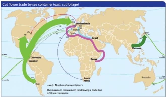 | ▲ 절화의 해상 컨테이너 운송 경로 및 운송량. 2015~2020년 사이 물류량이 40% 증가했다. |