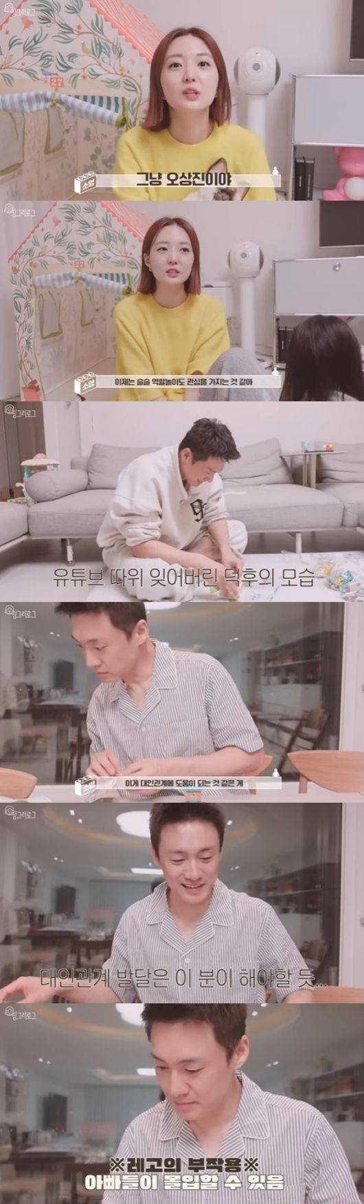 이후 오상진은 딸과 함께 레고를 조립하며 함께 시간을 보냈다. 한껏 열중한 두 사람을 지켜본 김소영은 "이 영상을 보니까 떠오르는 단어가 있다. 오덕후들. 정말 귀여운 덕후들의 모습이다"라고 말했다. 이어 집중하느라 대답조차 제대로 하지 않는 딸을 보며 "대답을 안하시는 모습이 참 닮으셨네요"라고 말했고, "누구랑?"이라는 오상진에 "님이랑요. 근데 오빠는 수아가 오빠랑 성격이 진짜 똑같지 않나. 집중하고 있을때 대답 잘 안하고 그럴때 어때? 나의 고통을 이해해?"라고 궁금해 했다.