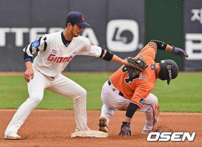 한화 이글스 문현빈이 4회초 무사 1루 채은성 타석때 2루 도루를 시도했으나 발이 베이스에서 떨어지며 태그 아웃되고 있다. 2023.03.26 / foto0307@osen.co.kr