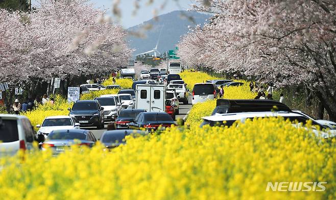 [서귀포=뉴시스] 우장호 기자 =맑은 날씨를 보이는 26일 오후 제주 도내 대표적인 봄꽃 명소인 서귀포시 표선면 녹산로에 벚꽃과 유채꽃을 감상하려는 상춘객들의 발걸음이 이어지고 있다. 2023.03.26. woo1223@newsis.com