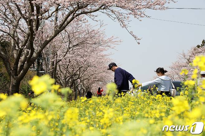 (제주=뉴스1) 오미란 기자 = 26일 오후 제주 서귀포시 표선면 녹산로에서 상춘객들이 벚꽃과 유채꽃을 구경하고 있다.2023.3.26/뉴스1