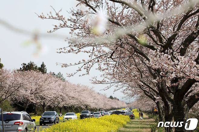 (제주=뉴스1) 오미란 기자 = 26일 오후 제주 서귀포시 표선면 녹산로에서 상춘객들이 벚꽃과 유채꽃을 구경하고 있다.2023.3.26/뉴스1