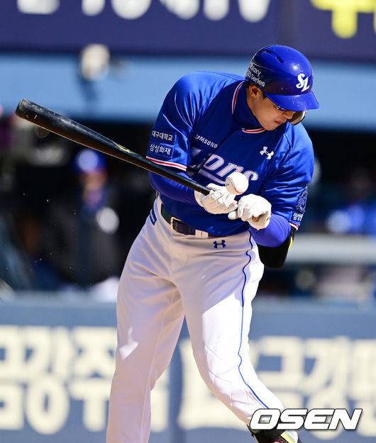 7회초 무사 1,2루에서 삼성 김동엽이 두산 박치국이 투구에 맞고 있다. 2023.03.26 /jpnews@osen.co.kr
