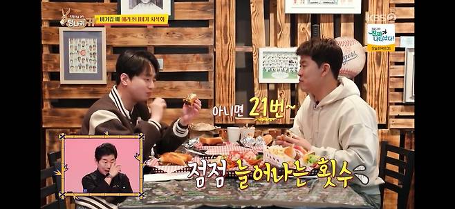 다른 버거도 먹던 이찬원은 "칼로리 때문에 매일 먹진 못하겠다"고 했다. 그러자 김병현은 "우리 집 버거는 한 달에 8번 먹어도 돼"라고 해 웃음을 자아냈다. 뒤이어 15번, 21번으로 횟수를 늘리며 너스레를 떨었다.