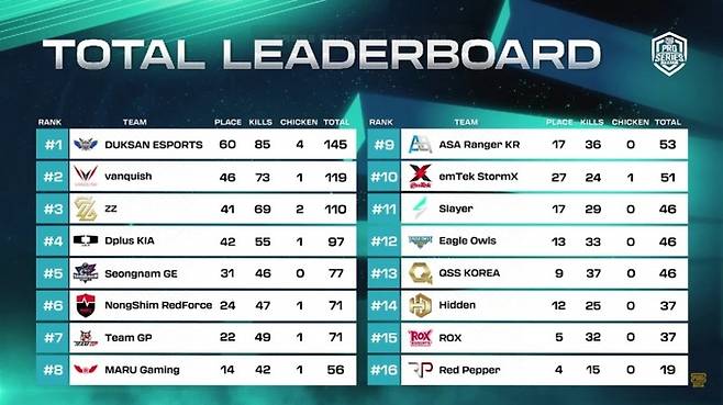 [스포츠서울 | 김지윤기자] 초반 연이은 조기 탈락으로 흔들리는 듯했으나 후반 뒷심이 힘을 더 했다. 덕산e스포츠가 총 4치킨으로 ‘펍지 모바일 프로 시리즈(이하 PMPS) 2023’ 시즌1 1주 차의 주인공이 됐다.