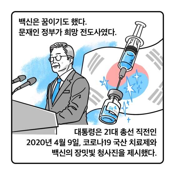백신은 꿈이기도 했다. 문재인 정부가 희망 전도사였다. 대통령은 21대 총선 직전인 2020년 4월 9일, 코로나19 국산 치료제와 백신의 장밋빛 청사진을 제시했다. 청와대는 “코로나19 치료제 및 백신 개발이 조기에 성공할 수 있도록 집중 지원하기 위한 범정부지원단을 구성해 이번 주부터 본격 가동한다”고 발표했다. 코로나19 백신 개발 등에 2100억원을 투자하고, 치료제 개발을 위한 연구개발(R&D) 투자를 추가경정예산에 반영한다고 밝혔다. 국산 치료제와 백신이 곧 개발돼 세계 각국이 한국산 백신을 구매하겠다고 줄을 서고 다양한 인종의 확진자가 한국산 치료제 덕분에 목숨을 건지는 상상을 유포했다.