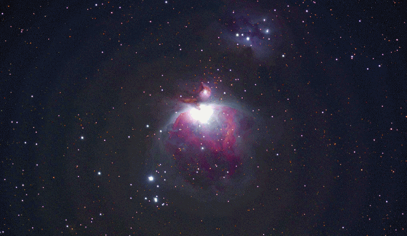 겨울철 오리온자리는 화려하게 밤하늘을 장식한다. 오리온의 벨트 아래 있는 별 세개 중 가운데 있는 별은 작은 망원경으로 봐도 성운임을 알수 있을 정도로 큰 성운이다. 메시에 카달로그에서 42,43번으로 불리는 오리온 대성운이다. [F7 TMB115 굴절망원경(0.8배 리듀서) + 적도의 + 6D]