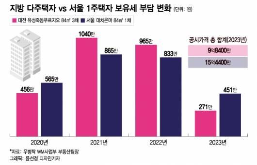 '대전 유성죽동푸르지오' 전용 84㎡의 공시가격은 2021년 3억9600만원, 2022년 4억8100만원이었다. 3채를 합친다 해도 11억8800만원, 12억5400만원에 불과해 당시 '은마' 전용 84㎡의 공시가격(2021년 17억200만원, 2022년 20억2600만원)에 미치지 못했지만 보유세는 A씨가 더 많이 부담해야 했다.
