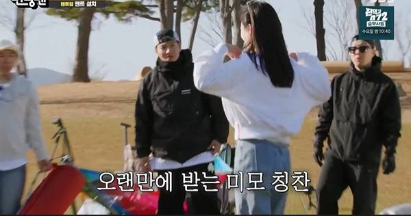텐트팀은 우여곡절 끝에 설치하는데 완성했다. 김종국과 하하는 갑자기 민낯인 전소미네 "청바지 흰티 예쁘다, (미인의)정석이다"며 칭찬, "이마에 핏대도 멋지다(?)"고 했고, 오랜만에 미모 칭찬에 전소민도 웃음 꽃이 피어졌다.