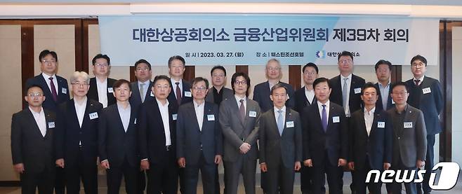 (서울=뉴스1) = 27일 서울 중구 웨스틴조선호텔에서 열린 '대한상공회의소 금융산업위원회'에서 우태희 대한상의 상근부회장(앞줄 오른쪽 세 번째)과 최현만 대한상의 금융산업위원회 위원장(앞줄 오른쪽 네 번째)이 참석자들과 기념촬영을 하고 있다. (대한상의 제공) 2023.3.27/뉴스1